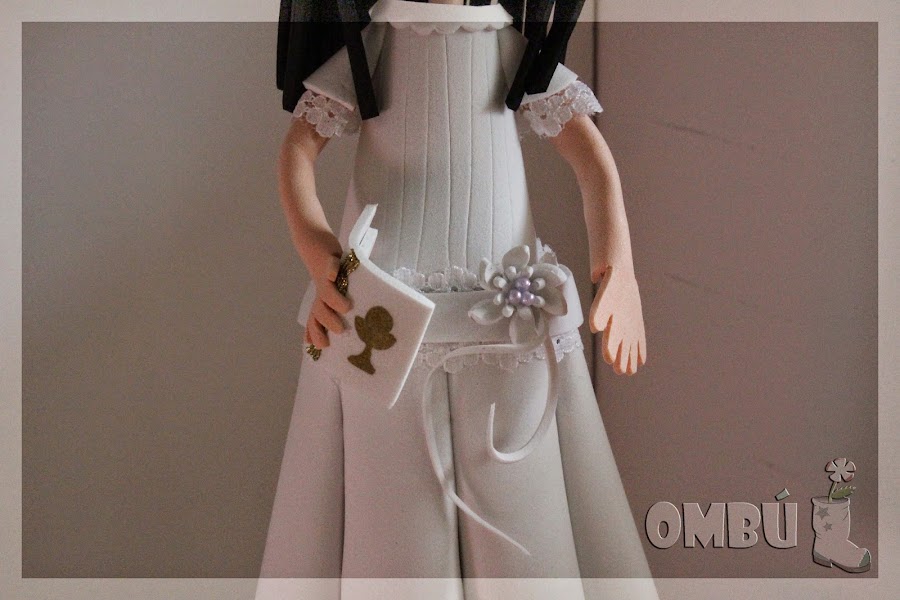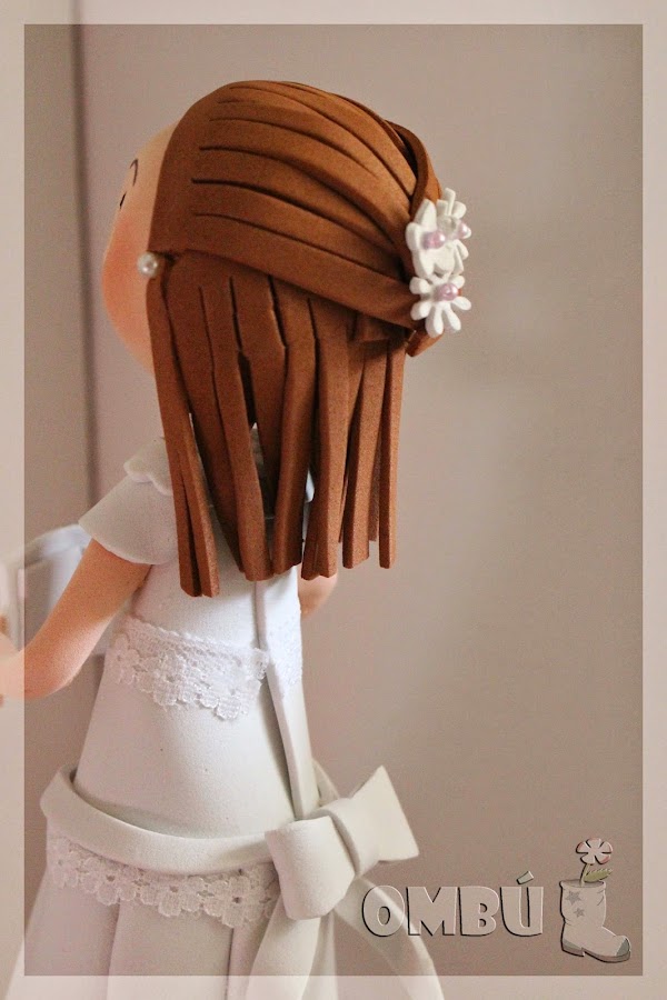 Y ahora, Piluka Claudia, que lleva un semi-recogido con flores para resaltar sus bonitos ojos verdes, encaje en el contorno y un gran lazo en la cintura...