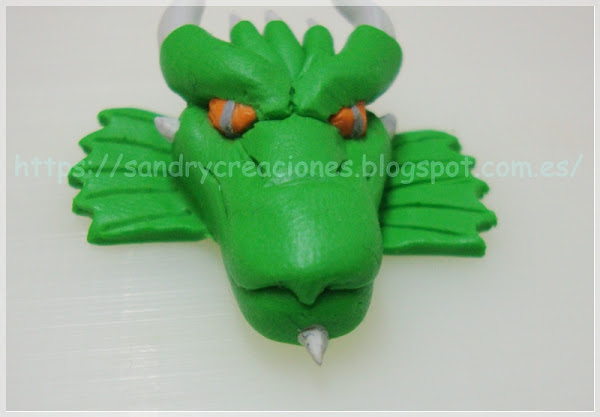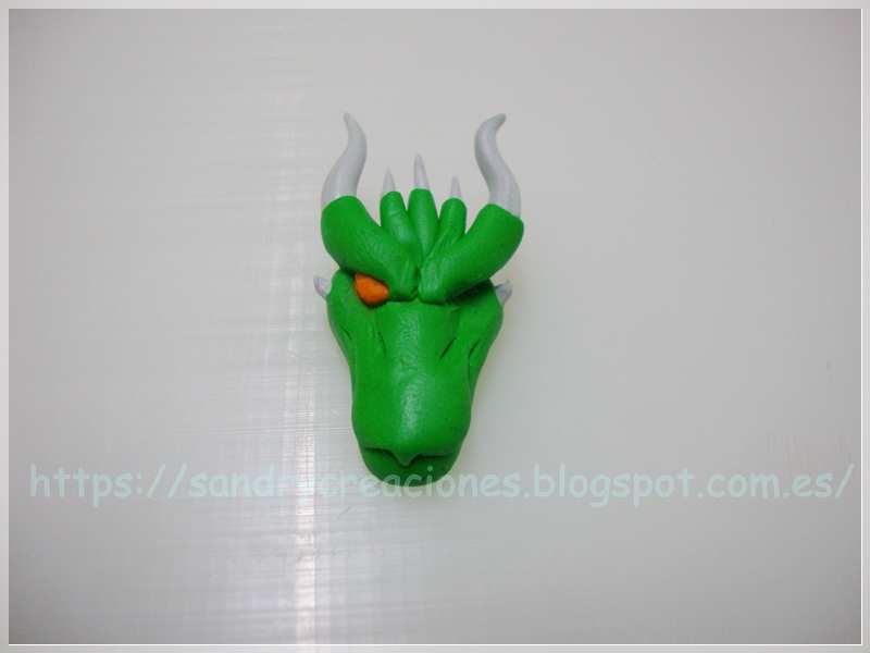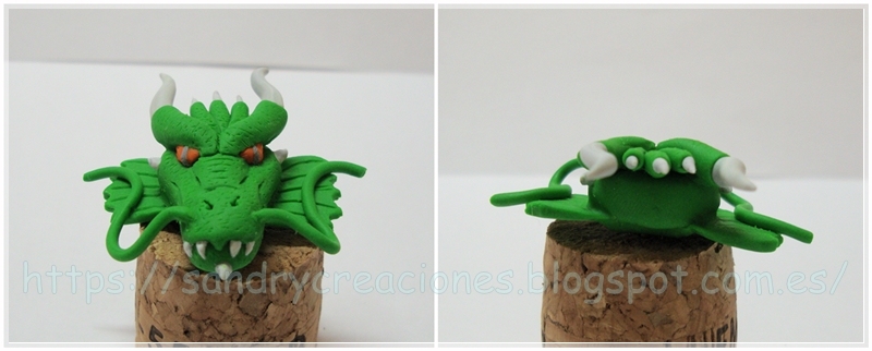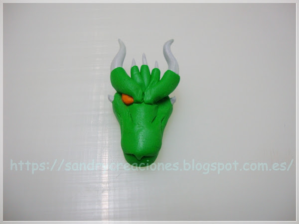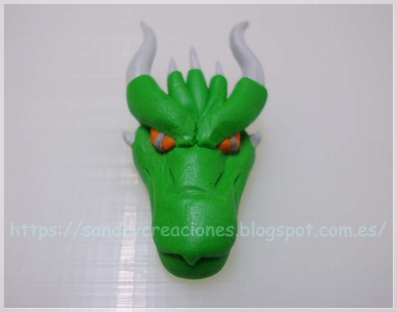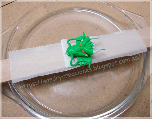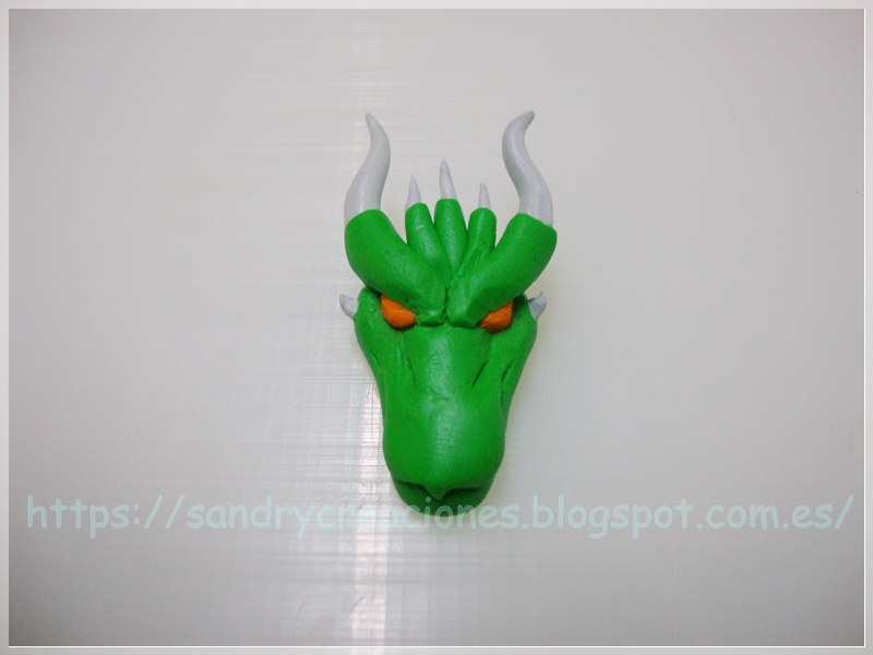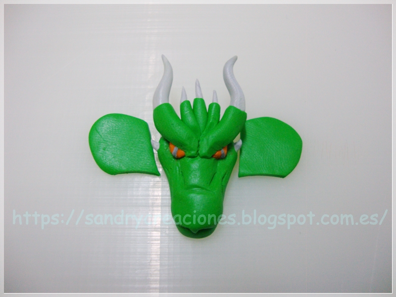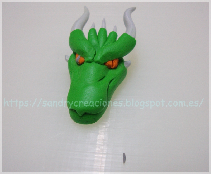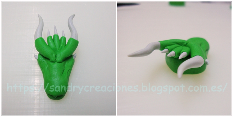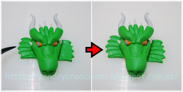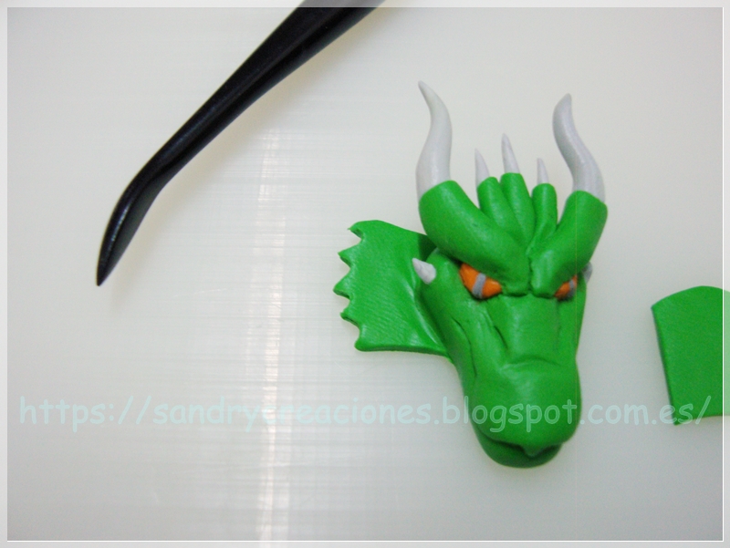 Nota: Como consejo podemos dejar reposar la cabeza de dragón unos 15 minutos para que no esté tan blanda o incluso ponerla unos minutos en el congelador aunque esto nos dificultará un poco el pegado de la pieza con la fornitura.