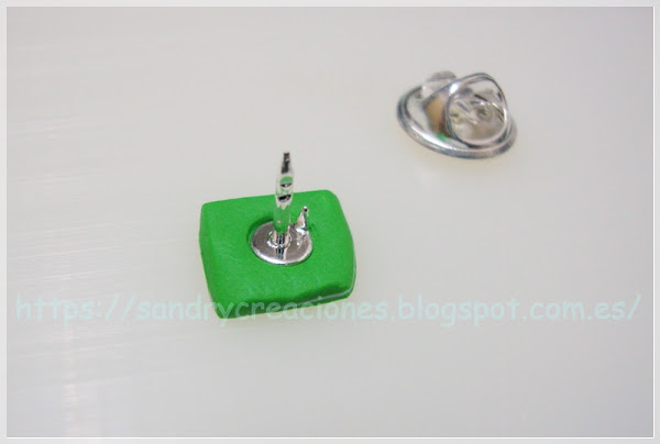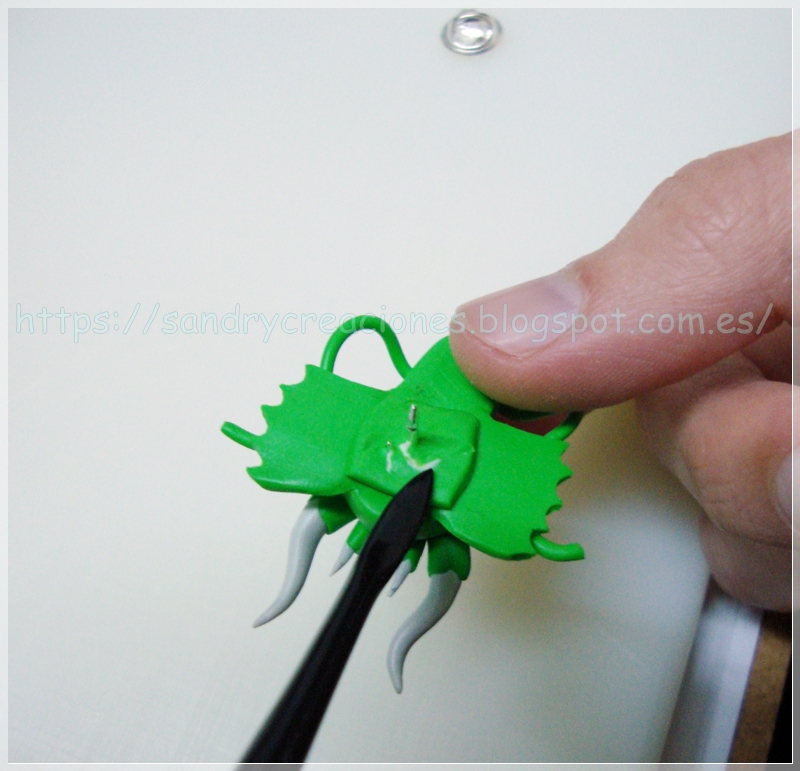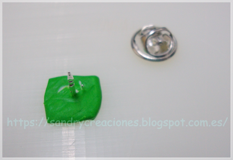 Paso 10. Ponerle la fornitura del pin. Una vez terminada la cara del dragón procederemos a colocar la fornitura del pin en la parte trasera superior de nuestra cara de dragón. Para ello cortaremos un trozo cuadrado de pasta polimérica verde y presionaremos un poco la fornitura encima para que quede bien encajada: