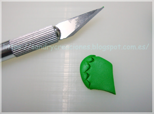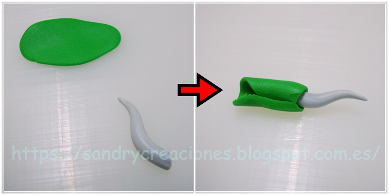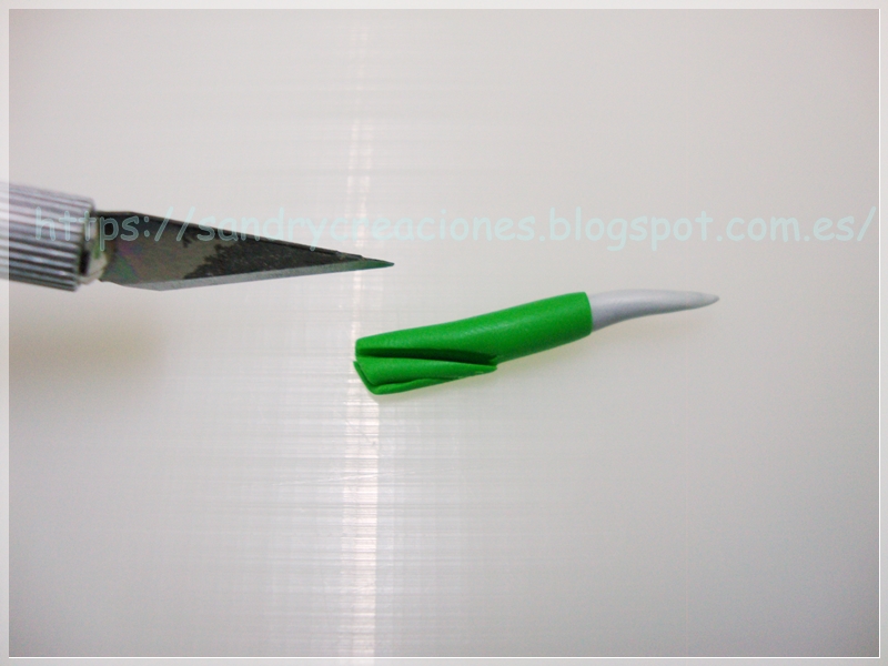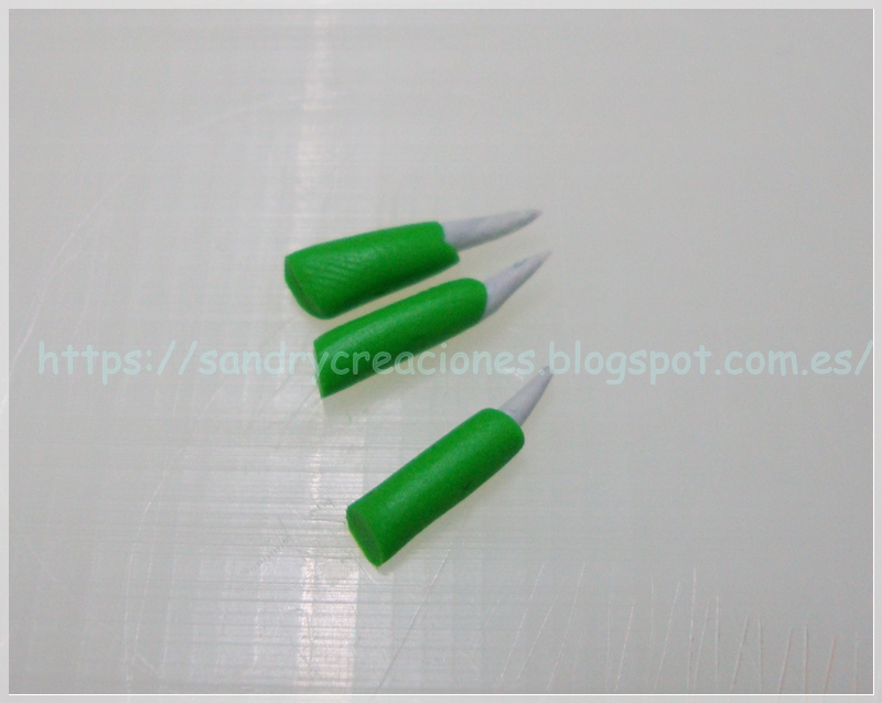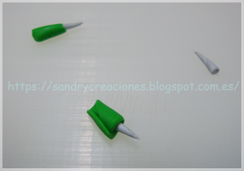 Luego envolvemos la parte inferior de estas púas con una pequeña lámina de pasta polimérica verde bastante fina: