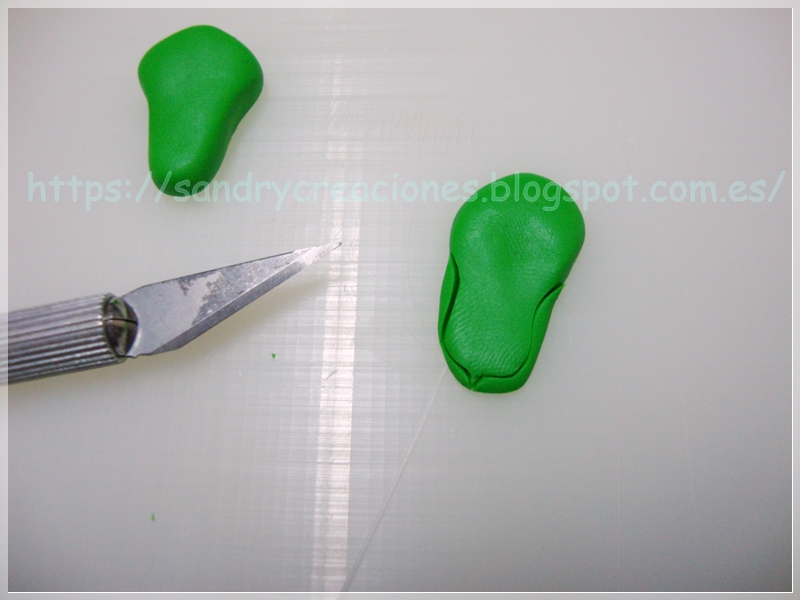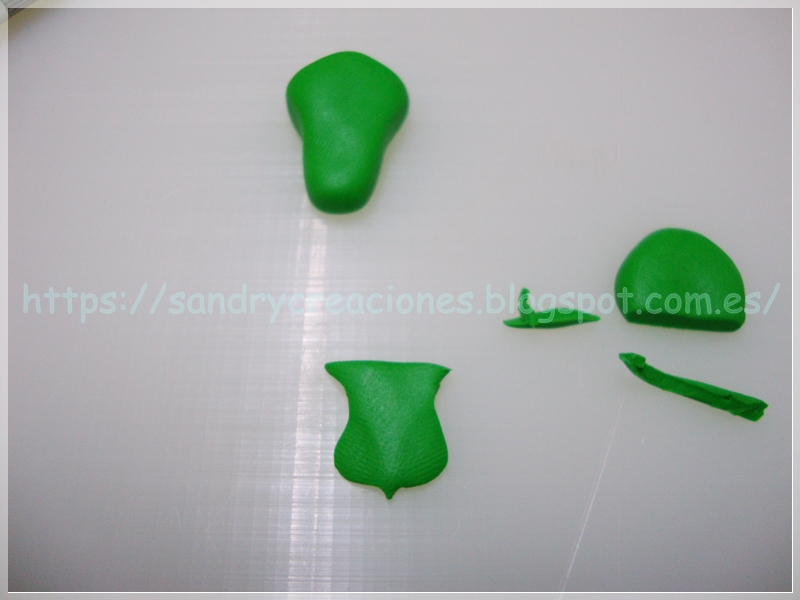 Paso 6. Aletas laterales. El siguiente paso será realizar las aletas que sobresalen en cada lateral de la cara de dragón, para ello hacemos dos trozos con pasta polimérica verde, los cuales aplanamos bastante y les damos una forma de oreja sin lóbulo: