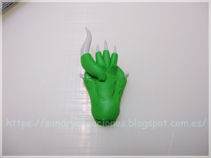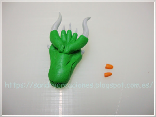 Los últimos cuernos que haremos por ahora son los mas grandes, estos tienen la complicación que son los mas grandes y que son los que delimitan la parte superior de los ojos del dragón y por tanto su expresión facial. Para hacerlos seguimos el mismo procedimiento que con los tres cuernos pequeños, pero esta vez las dos púas de mezcla de pasta polimérica blanca y negra serán mas grandes y las curvaremos y la parte verde será mas extensa: