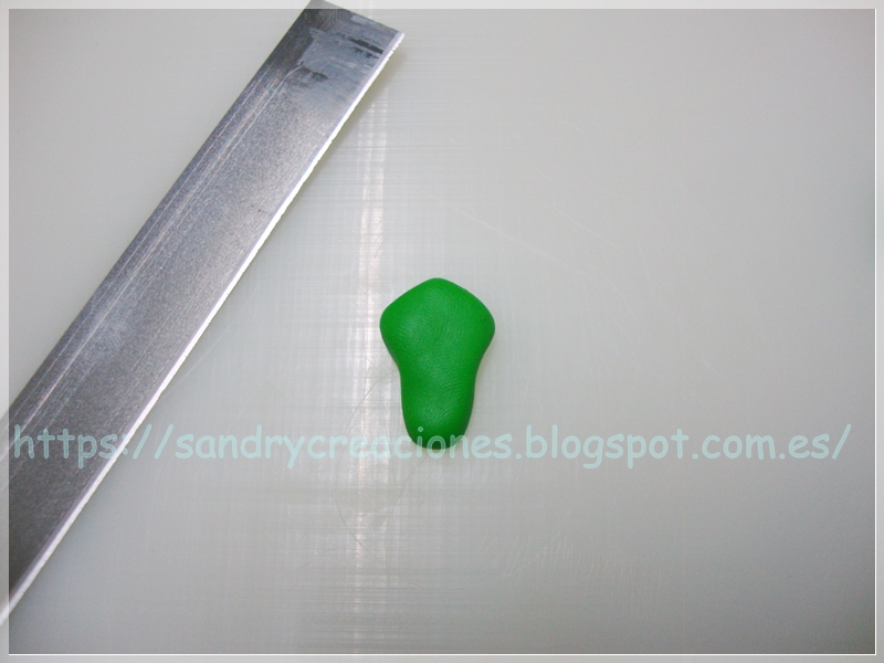 Paso 3. Confección del morro. Para realizar el morro del dragón cogemos un trozo de pasta polimérica verde y la aplanamos bastante, le damos una forma parecida a la pieza del paso 2 y con cúter recortamos en la parte mas estrecha como dos mofletes y una púa en la parte central como se puede ver en la imagen siguiente: