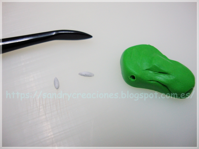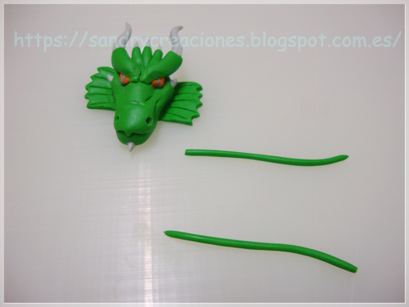 Paso 8. Bigotes del dragón. Para terminar con la estructura general del dragón solo nos faltarían los bigotes, para ello cogemos un trozo de pasta polimérica verde y lo alargamos hasta conseguir el grosor que queramos para los bigotes, luego cortamos ese churro resultante en dos partes iguales y le afinamos una de las puntas. Los dejamos un momento aparcados y recuperamos la cara de dragón en la cual hacemos dos agujeros con una herramienta de modelar en el lugar donde queremos que salgan los bigotes: