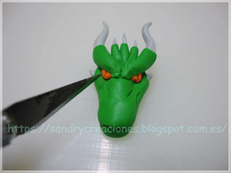 Tras esto, con un cúter fino hacemos una hendidura en cada ojo, que serán donde colocaremos las pupilas grisáceas alargadas del dragón: