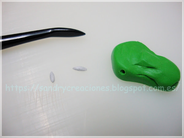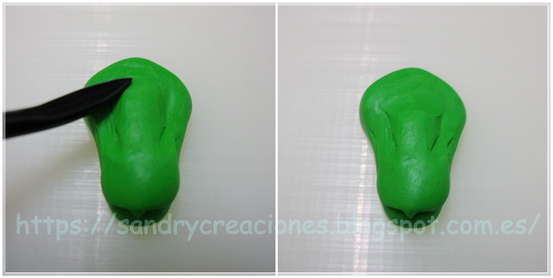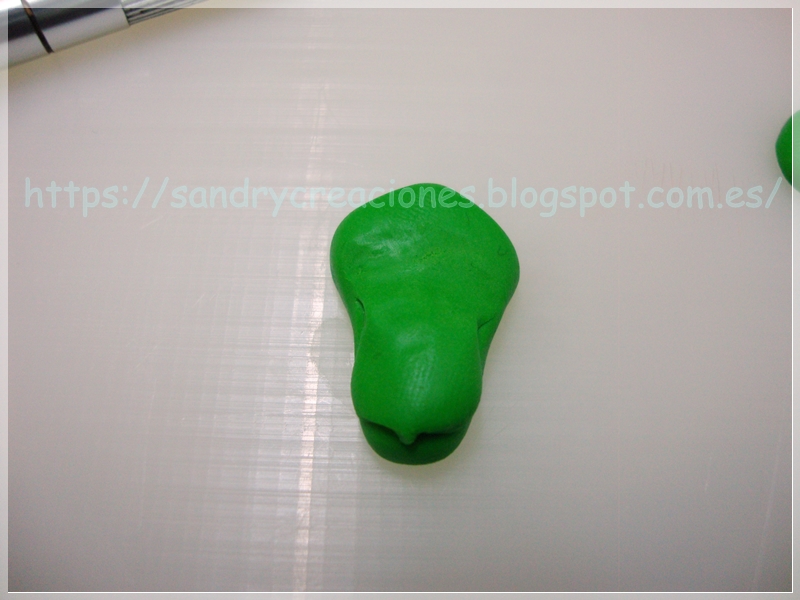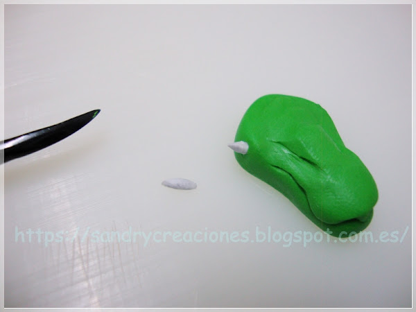 Para terminar con la mandíbula superior colocaremos un pequeño trozo de pasta polimérica verde seguido de donde unimos la anterior pieza, uniremos, aplanaremos y daremos forma hasta conseguir la estructura del morro deseada: