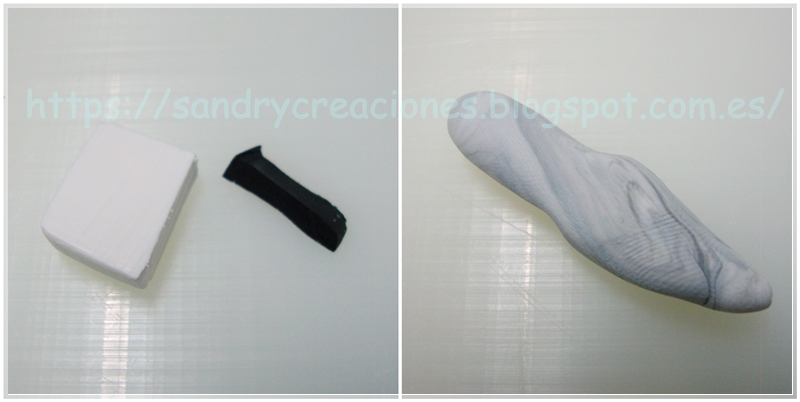 Empezamos por mezclar pasta polimérica blanca con algo de pasta polimérica negra, pero sin dejar que se mezclen completamente y tengamos un color blanco con tonos grisáceos: