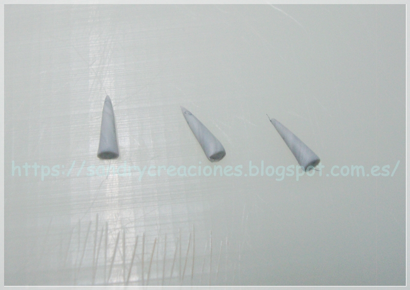 Los siguientes cuernos que haremos serán los pequeños que sobresalen por detrás de la cara, para ello hacemos tres púas con la mezcla de pasta polimérica blanca y negra:
