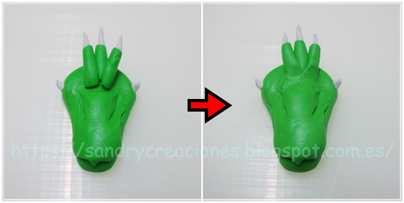 Paso 11. Últimos detalles antes de hornear. Para terminar completamente con la cara de nuestro dragón, con un cúter fino y sin presionar mucho vamos texturizando la piel del dragón, haciendo pequeñas rayas que simularan la piel escamosa de los dragones: