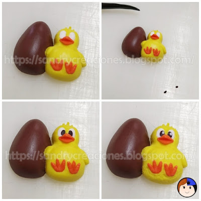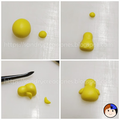 Como detalle opcional con un poco de arcilla polimérica del color amarillo, usado para realizar el cuerpo del pollito, podemos hacer una pequeña cresta en la parte superior de la cabeza del pollito.