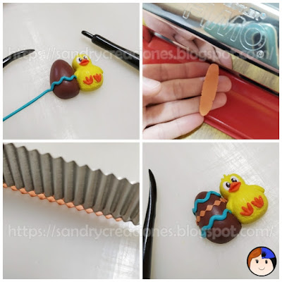 Paso 7. Adornos del huevo de Pascua. Utilizando arcilla polimérica de diferentes colores realizamos los adornos del huevo de pascua. Nosotros primero hicimos churros de color azul que colocamos de forma ondulada sobre el huevo. Después hicimos una lámina de color naranja claro con la laminadora y con un cúter ondulado creamos una cenefa que colocamos entre los churros azules.