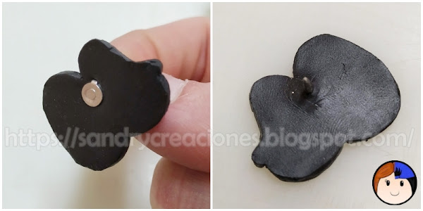 Para seguir trabajando correctamente con la parte de arcilla polimérica negra sin que nos moleste la púa del pin y nos deforme la pieza. Lo mejor es colocar esta pieza sobre una fina lámina de madera cubierta con papel de horno donde previamente le habremos hecho un agujero por donde entrar la púa y de esta forma podamos trabajar y hornear la pieza completamente plana.