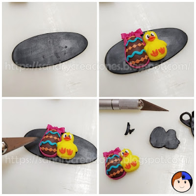 Paso 10. Realización Parte Trasera. Una vez cocida la parte del pollito y el huevo de Pascua realizamos la parte trasera con arcilla polimérica negra. Para ello hacemos una lámina de un par de milímetros de grosor con la laminadora, colocamos la pieza que terminamos en el paso 9 encima y con un cúter fino recortamos la silueta en la lámina de arcilla polimérica negra. Seguidamente hacemos los últimos cortes y pulidos con el cúter para que encajen perfectamente y pasamos al siguiente paso.