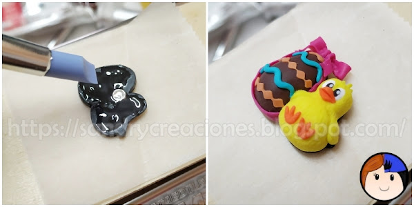 Paso 12. Unión de las dos piezas creadas con Fimo Líquido. Al trabajar con una pieza ya horneada y dura y otra sin hornear y blanda, necesitamos algo que las una bien. Para ello utilizamos arcilla polimérica liquida, en nuestro caso de la marca Fimo, y esparcimos una fina capa por toda la superficie de contacto de la pieza negra. Tras esto colocamos la pieza del pollito y el huevo de Pascua encima en la posición correcta y presionamos ligeramente.