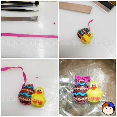 Paso 8. Lazo del Huevo de Pascua. Con arcilla polimérica de color rosa fucsia y la ayuda de la laminadora realizamos el lazo. Primero hacemos una cinta de muy poco grosor que iremos colocando alrededor del huevo y seguidamente, con cuidado y paciencia, realizamos el lazo y lo colocamos en la parte superior del huevo de Pascua.