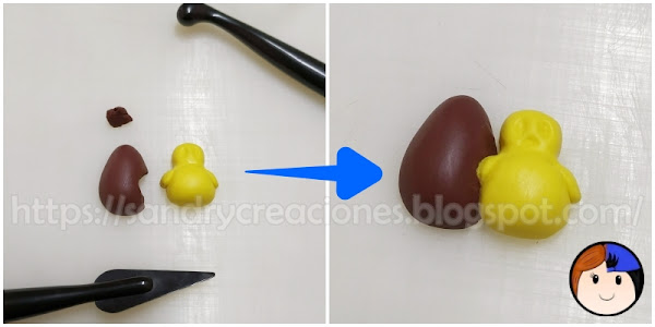 Paso 4. Unión del huevo y el cuerpo del pollito. Recuperamos el huevo que habíamos realizado en el paso 2 y con un cúter o herramienta de modelado sacamos parte del lateral del huevo, donde se unirá con el pollito, para que encaje perfectamente con él. Acto seguido ponemos en contacto las dos piezas sin apretar mucho para no deformar ninguna de las dos formas.