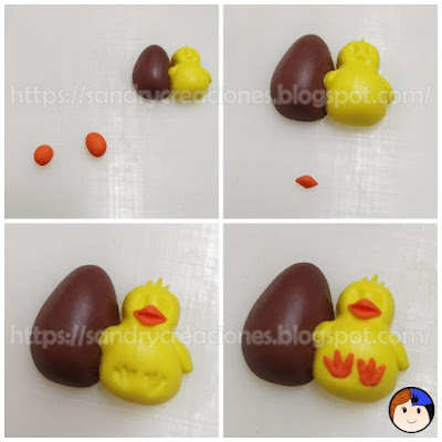 Paso 5. Pico y patas del pollito. Tras la unión del huevo y el pollito terminamos de dar los detalles al pollito. Primero hacemos el pico con un trocito pequeño de arcilla polimérica naranja que moldeamos en forma de pico. Luego le damos un corte en la zona central y separamos un poco la zona del corte para dejar el pico abierto y finalmente lo posicionamos en la zona correcta de la cabeza del pollito sin presionar mucho. Para realizar las patas del pollito, hacemos pequeños trozos cilíndricos de arcilla polimérica de color naranja que corresponderán a los tres dedos de las patas y los colocamos en la zona donde queramos que estén las patas del pollito. Damos una suave presión y terminamos de moldear con las herramientas de moldear para dejar las patas bien pulidas.
