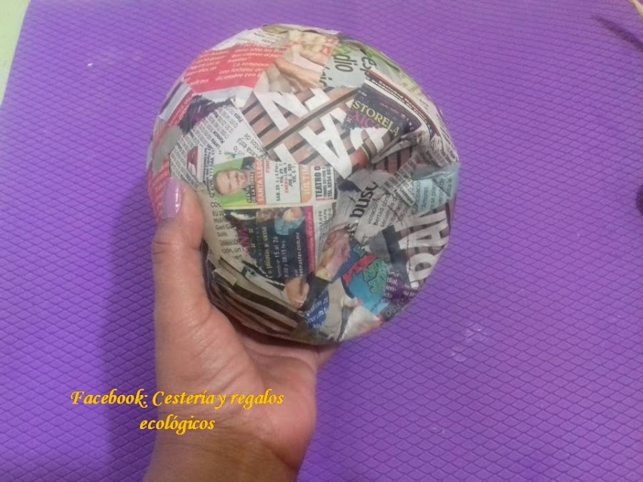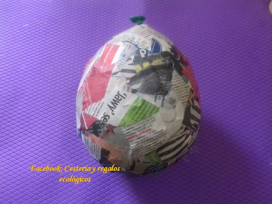 Luego, forramos con pedazos pequeños de papel y una mezcla aguada de pegamento o cola blanca, aplicamos 4 capas...