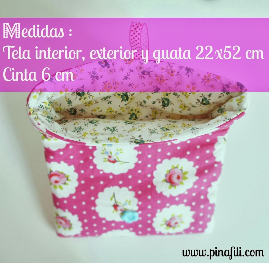 Es una bolsa de dos telas de algodón y entre ellas lleva una capa de guata para que lo que guardemos en ella vaya bien protegido. Se dobla y se cierra con un botón. Las medidas para hacerla son: