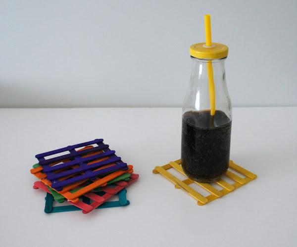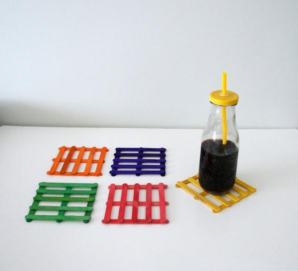 Me encanto esta idea cuando la vi por Pinterest, esta red social es un pozo sin fondo para buscar inspiración, es una maravilla.Como os decía, estos palos los podemos encontrar en las tiendas de manualidades, tanto de colores como en madera. Son muy económicos y vienen muchos en el paquete. A mi me han salido media docena de posavasos, que estoy deseando estrenar en una cenita de verano.