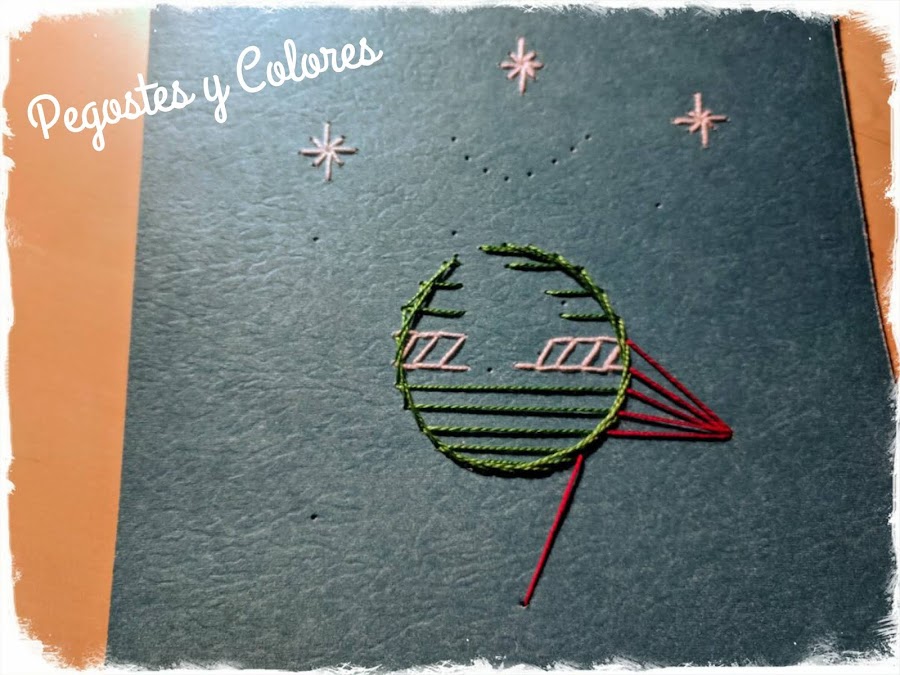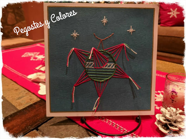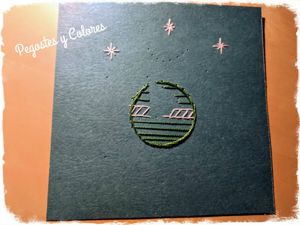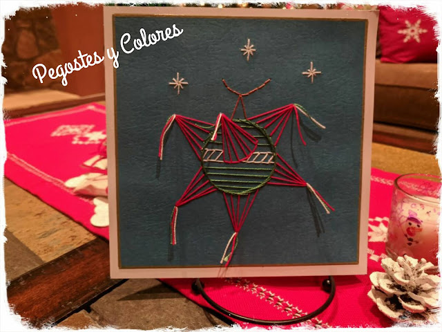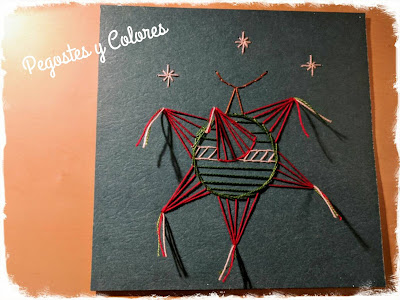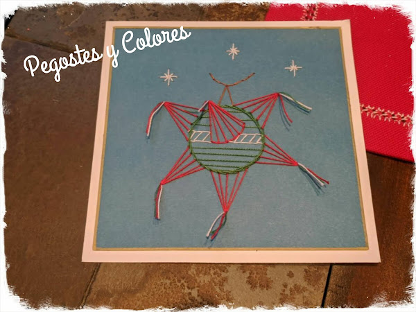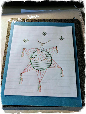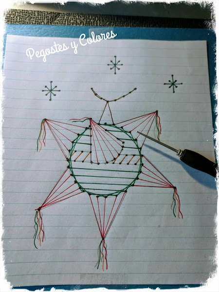 Como las posadas se hacen cuando ya oscurece, por eso la hice con un carton azul oscuro y por eso hay estrellas en el cielo. Las estrellas se hacen con hilo blanco y todas las puntas convergen en el centro.