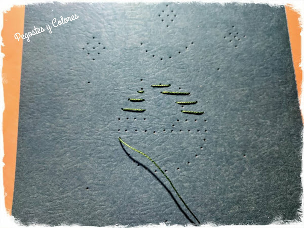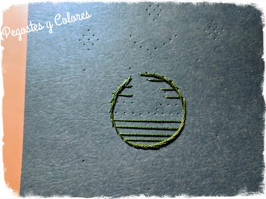 4.- Por el reverso, se ven y se sienten las perforaciones de cada punto con relieve, de ese lado introducimos la aguja con el color que elijas. En mi caso comencé con el verde para hacer primero el relleno y orilla de la piñata.