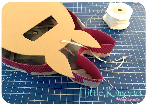 6. Pasamos la cinta a través de los agujeros y atamos. Ahora podemos seguir armando nuestra piñata, seguiremos el mismo proceso del paso 2 para pegar la tapa trasera.
