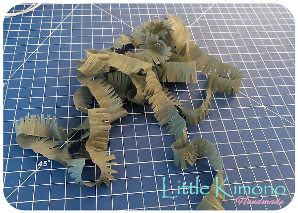 8. Con el papel crespón tal y como viene doblado de fábrica cortaremos tiras (el ancho según prefiráis) y con la tijera haremos cortes para crear una especie de flecos cuando la desenrollemos.