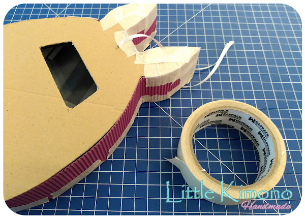 La haremos en la parte inferior de la figura (en la cartulina corrugada), dejando un margen de unos 2cm en los bordes donde van las tapas, como muestra la imagen ;)