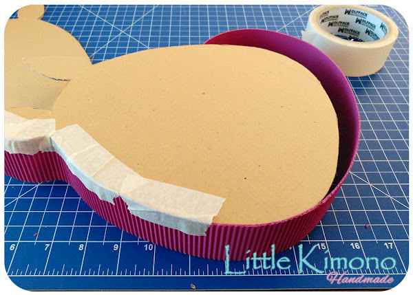 2. Con las dos piezas cortadas ahora pasaremos a darle forma a la piñata, para ello vamos a usar la cartulina corrugada que por su estructura nos ayudará a darle forma con más facilidad a la silueta, así que vamos a cortar una tira ancha y la vamos a ir pegando en el contorno de una de las tapas con ayuda de la cinta de pintor.