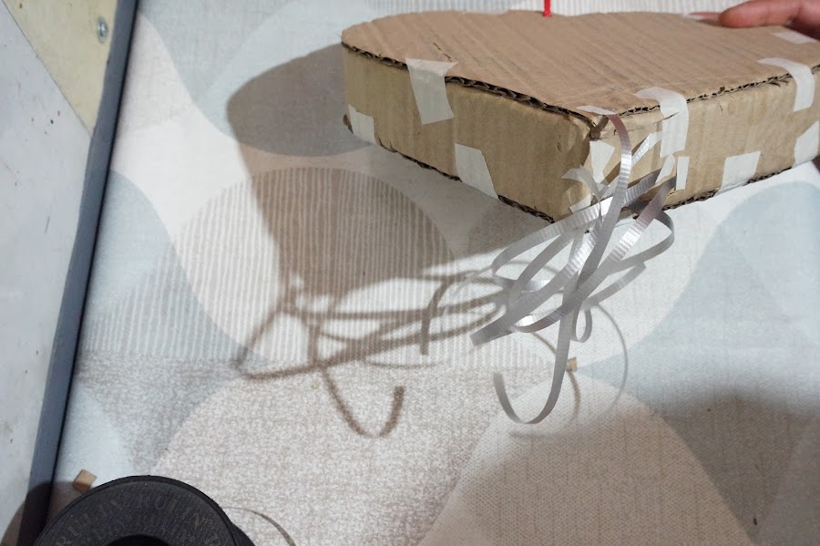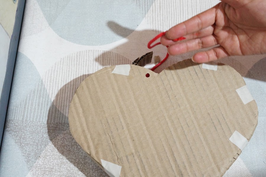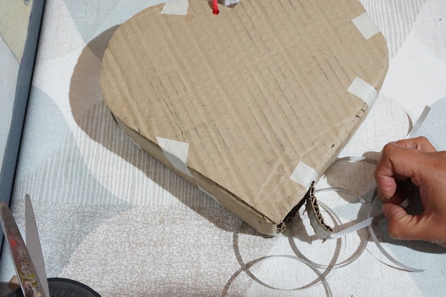 Una ves echo el rectángulo, pega diferentes tiras de cinta, pero que sean fáciles de quitar y has una que permita que al jalar, se habrá el rectángulo de cartón por donde saldrán los dulces.