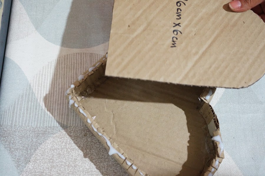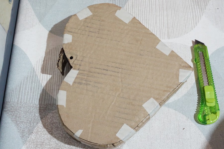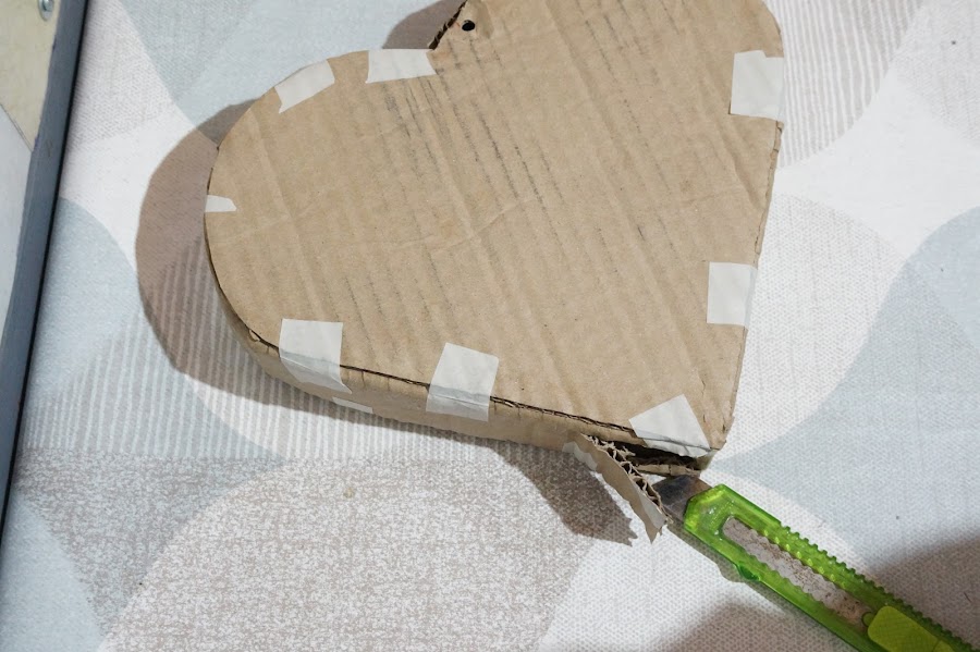 Pega el segundo corazón con las pestañas y ahora has unas perforaciones en la parte superior para la asa y por abajo corta un rectángulo con el cutter por donde saldrán los dulces.