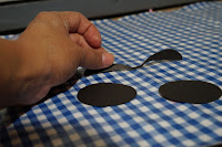 Pegaremos en lo demás, con el papel china negro cortado en tiras y también únicamente la carita con el papel china rosa.