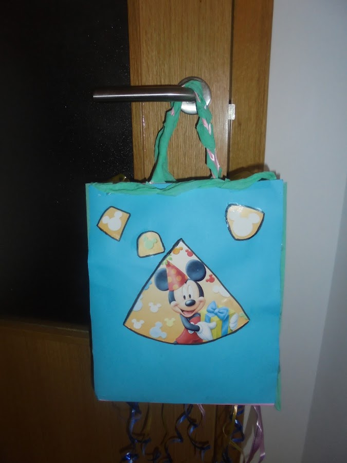 Después ya pasé a decorar la piñata con una cartulina. Puse el nombre y los años, en la parte delantera. Y unos dibujos de micky en la trasera.