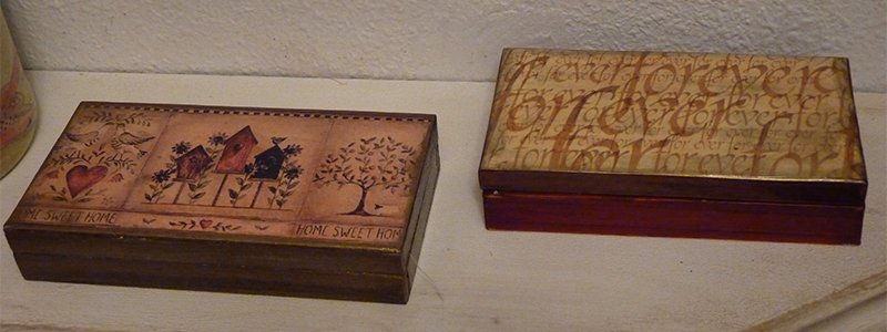 Aire vintage en acabados y diseños:Flores y gris piedra con pincel seco en blanco y ligeros toques dorados, y burdeos con dorado en la otra.