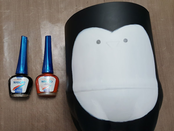 En papel periódico hice el patrón del rostro del pingüno y lo tranferí a la botella