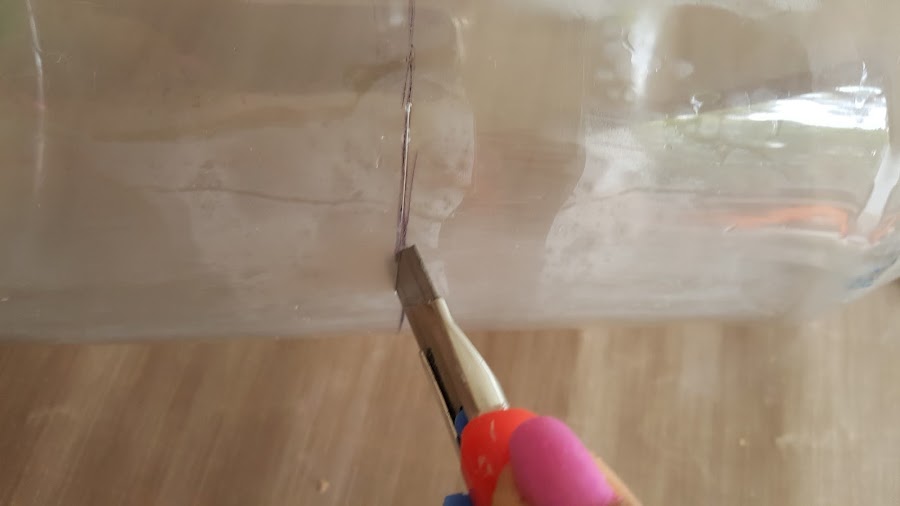 Hice una incisión inicial con el bisturí y después corté la botella con las tijeras