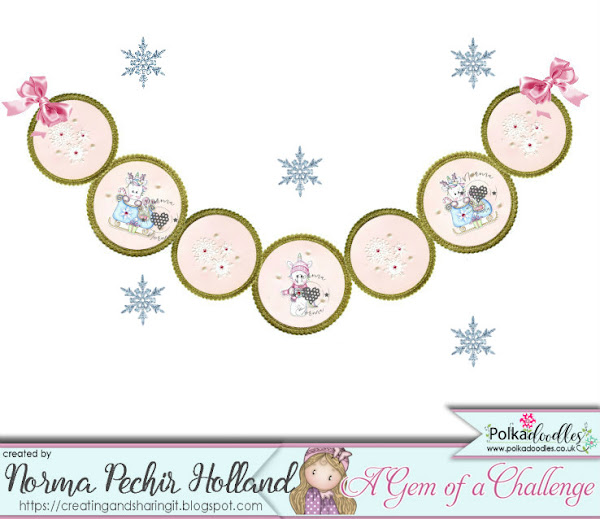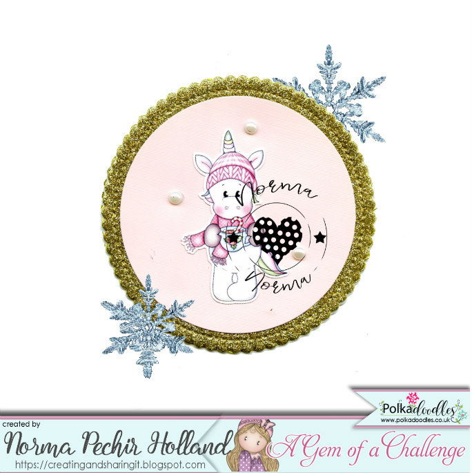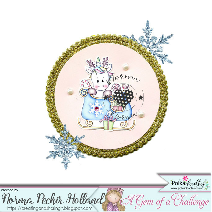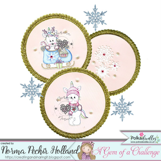 Para esta epoca me encanta hacer guirnaldas, asi que decidi hacer una usando los adorables unicornios de Pink Gems y de esta forma lograr una linda y tierna. Los que use: Christmas unicorn hot chocolate, Christmas unicorn Santa sleight y unos troqueles de copo de nieve que tenia, perlas piedritas...