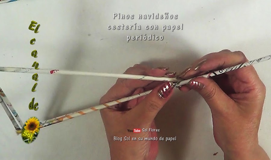 Para hacer las varillas de papel yo usé tiras que miden 13 cm. de ancho por 50 cm. de largo y para enrollar una brocheta normal, estas varillas son únicamente para darle firmeza al primer triángulo, las demás varillas las haremos con la mitad, es decir con tiras de 6 y medio centímetros de ancho y enrolladas con la misma brocheta. Añadimos dos varillas gruesas y doblamos un extremo, medimos 20 cm., doblamos dos veces y luego medimos 15 cm. y también doblamos