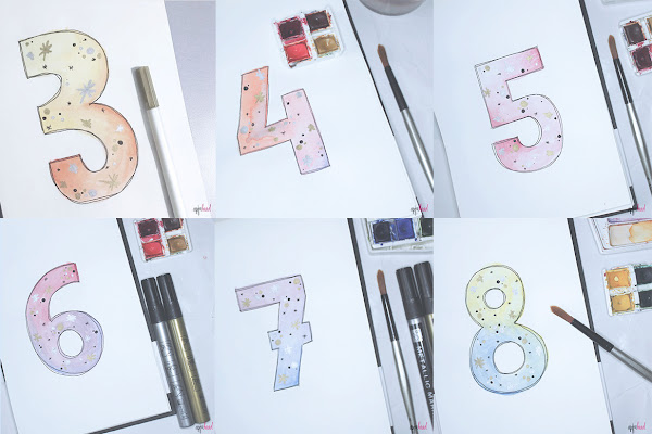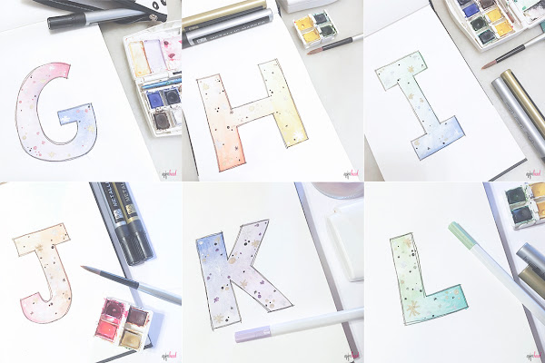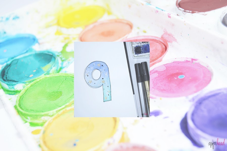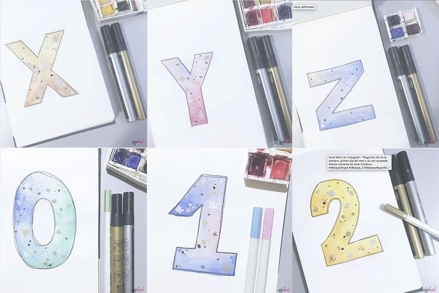 Como ves he escogido una temática, un formato de letra y he ido haciendo todas las letras y números del mismo estilo. Letras básicas pero gruesas, pintadas con acuarela creando pequeñas galaxias multicolor.