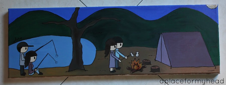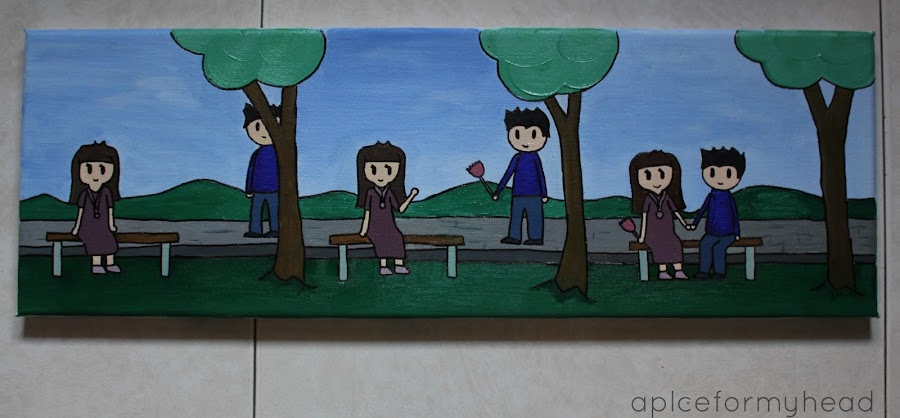 Todavía quedan dos cuadros más por pintar. Lo que tengo pensado es hacer al nene y a la nena, uno en cada cuadro. Serás más pequeños, como de medio folio e irán colocados en los extremos de la composición, cada uno a un lado. ¿Que os parece esta idea?