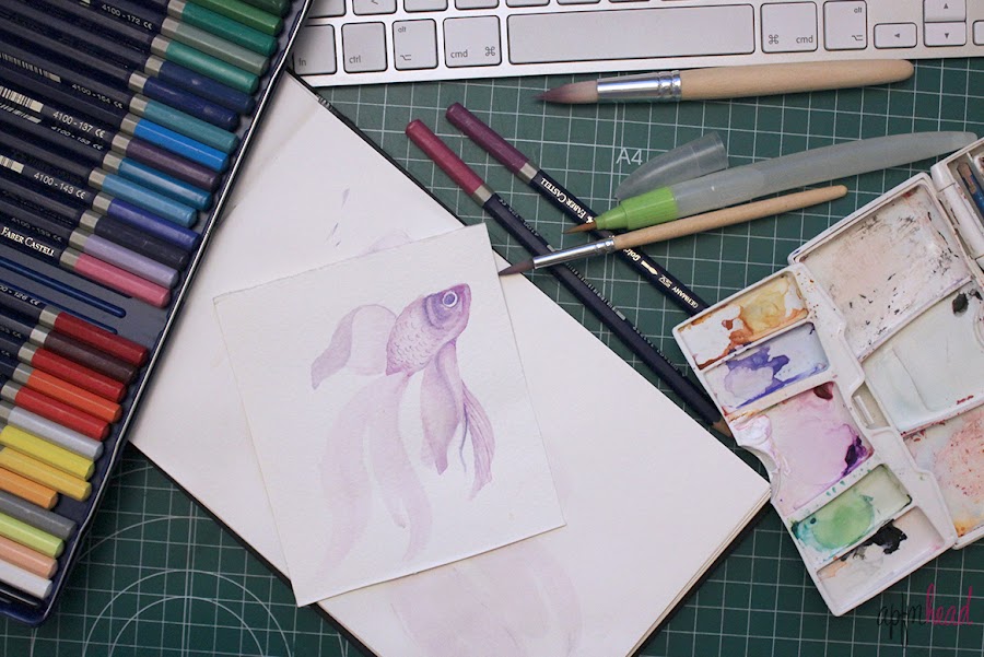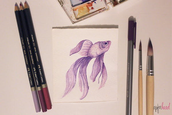 Cogí las acuarelas, lápices acurelables, los pinceles con depósito y mis pinceles de Ikea y un trocito de papel para acuarela y a pintar! Últimamente cuando tengo que escoger un color me decanto por los tonos morados, de modo que el pez salió morado.