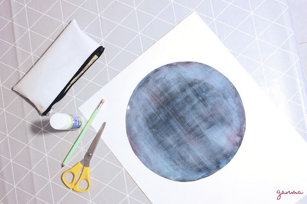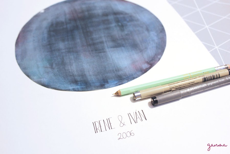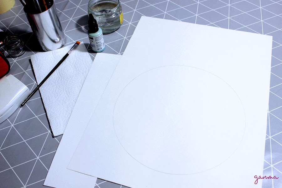 Empezamos dibujando un gran círculo en el papel dejando bajo suficiente hueco para el texto. Yo cogí un plato para este paso ya que mi hoja era un A3. Para no salirnos del círculo al pinar podemos utilizar algo de cinta, washitape, etc.