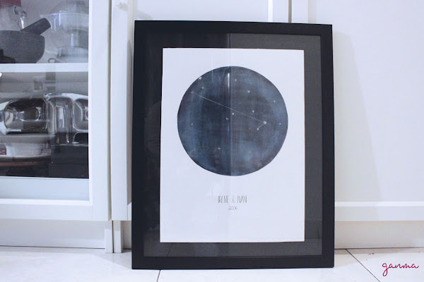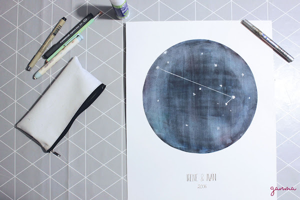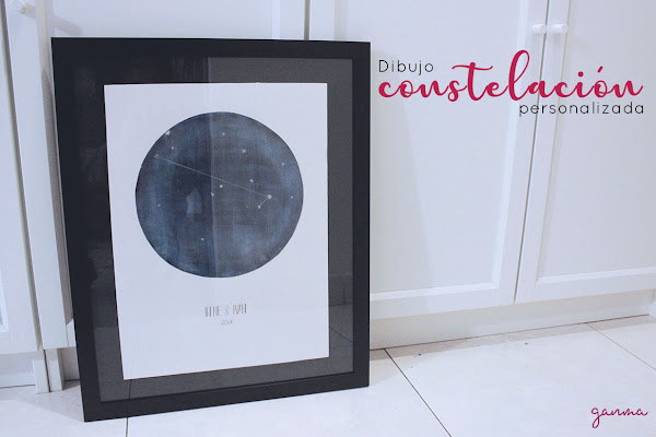 Para la constelación he tomado de referencia un mapa de España, y con rotulador plateado he marcado con estrellas las ciudades que hemos visitado, donde hemos vivido, etc éstas últimas las he marcado mas grandes y unido con líneas creando una constelación.