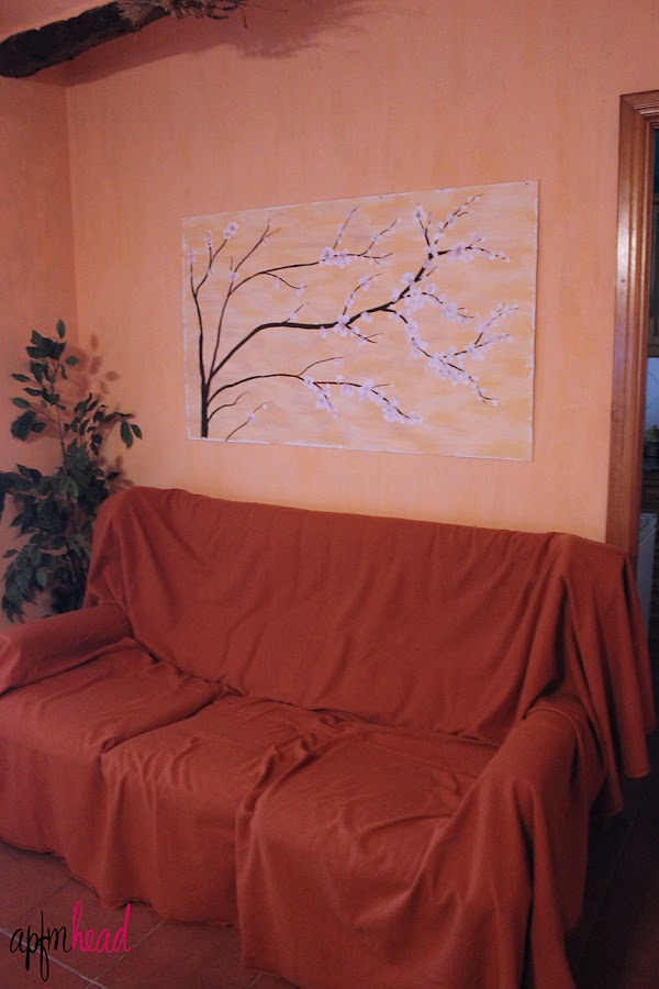 Con una tabla de la parte trasera de un viejo armario corté a medida para colocarla encima del sofá del comedor de la casa del pueblo. El cuadro mide 1,20 x 1 metros, es de los cuadros más grandes que he pintado. Los colores para el fondo son tonos salmón, ya que el comedor está pintado en esos tonos.