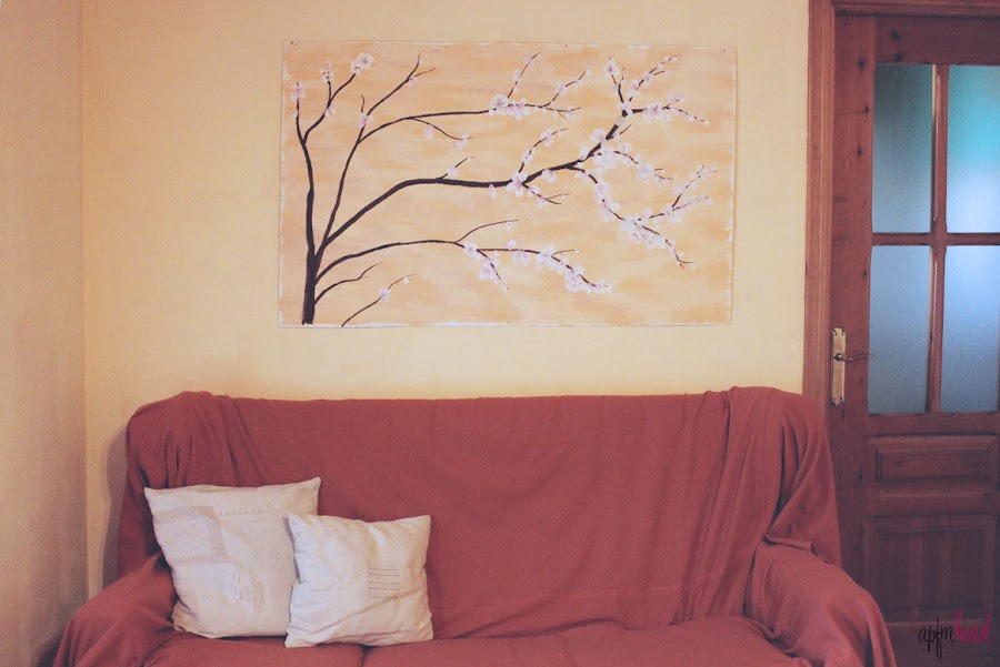 El dibujo es una gran rama de cerezo con flores, iba a tener muchas mas flores pero mi madre dijo que lo dejara así, le gustaba como estaba. Tardé unos 3 días en pintarlo, tres días que son tres ratos, un par de horas cada día mas todo el tiempo de secado.