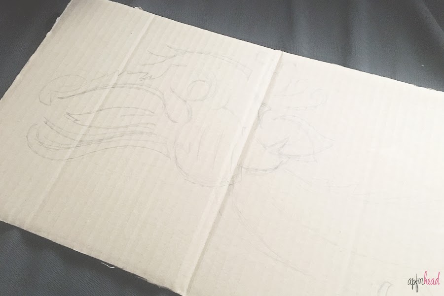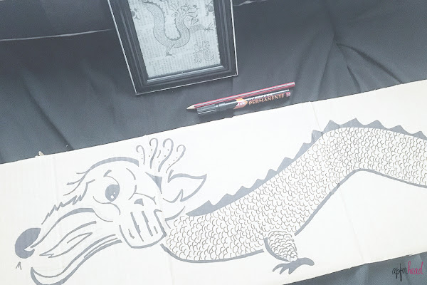 En un momento tuve el dibujo realizado a lápiz sobre el cartón y con un rotulador negro permanente de punta ancha repasé las líneas y con uno mas fino hice las escamas.