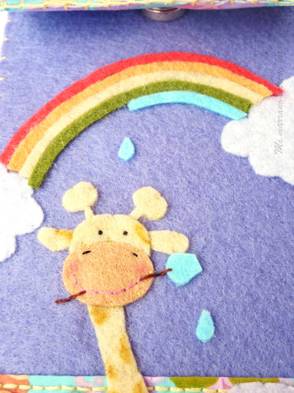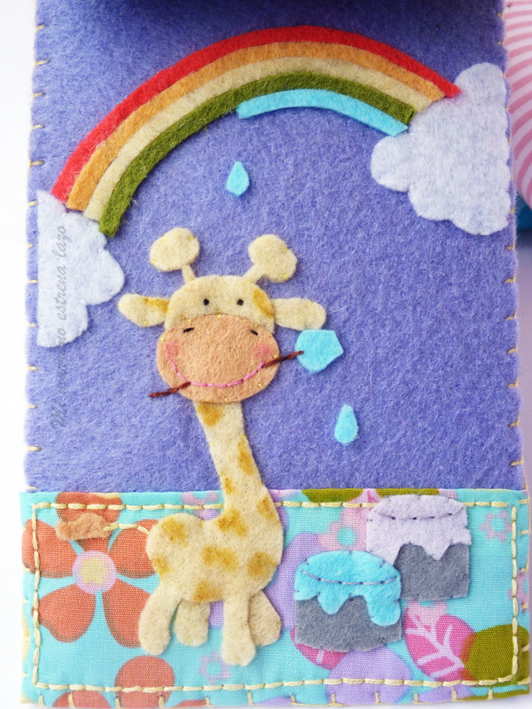 Es una funda de colores vivos y divertidos, donde la protagonista es una jirafa muy simpática que se ha levantado por la mañana, ha visto el cielo muy aburrido y ha dicho: Voy a pintar el arco iris!!! y ahí está, toda afanada con los colores, ya está terminando el azul y solo le queda el violeta :)