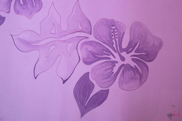 Las flores las he colocados en dos de las paredes, están en tonos violeta igual que el color de la pared. La pintura que he utilizado es pintura de pared con tinte morado, es el mismo color que utilicé en este taquillón. Te dejo con el vídeo para que veas el proceso de pintura de una de las flores.