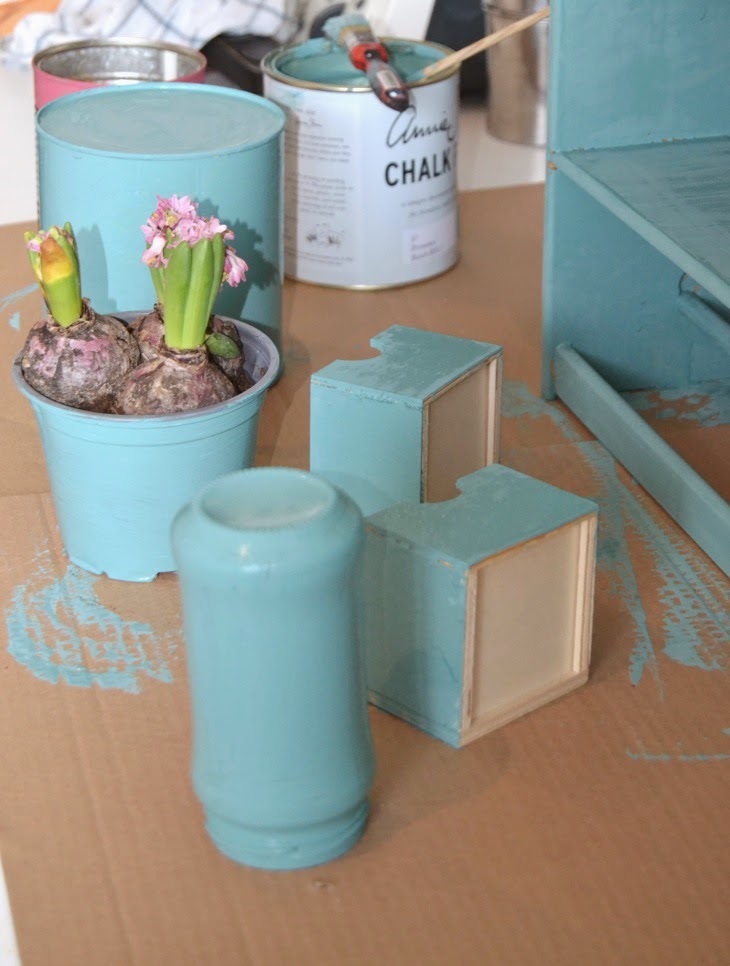 Mi última adquisición es esta maceta con tres bulbos. La maceta era de plástico muy fea, así que me he decidido a pintarla con el chalk paint turquesa que compré en el DIY Show. Yo suelo usar mucho la receta casera, pero este color me encantó.